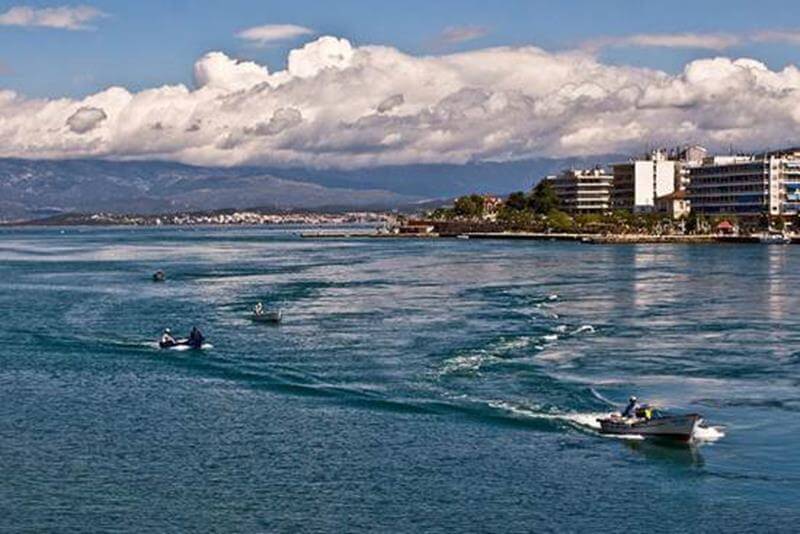 Ο πορθμός του Ευρίπου έχει πλάτος 39 μέτρα, μήκος 40 μέτρα και βάθος 8,5 μέτρα. Σε αυτόν παρουσιάζεται το εξής «περίεργο» φαινόμενο: τα νερά του κινούνται συνεχώς, ενώ ταυτόχρονα αλλάζουν φορά κινήσεως. Άλλοτε κατευθύνονται προς τον Βόρειο και άλλοτε προς τον Νότιο Ευβοϊκό. Μετά από συστηματικές παρατηρήσεις διαπιστώθηκε ότι 22 – 23 ημέρες κάθε μήνα το ρεύμα παρουσιάζει μια κανονικότητα και αλλάζει φορά κάθε 6 ώρες περίπου, με αποτέλεσμα να συμπληρώνει τέσσερις εναλλαγές κάθε 24 ώρες και 50 λεπτά όπως ακριβώς η παλίρροια. Από τις ημέρες του κανονικού ρεύματος 11-12 αντιστοιχούν στην περίοδο της Νέας Σελήνης και άλλες τόσες στην περίοδο της Πανσελήνου. Πολλές φορές παρουσιάζεται μια αρρυθμία, οπότε το φαινόμενο ολοκληρώνεται σε 22 ώρες και 22 λεπτά. Τις υπόλοιπες 6 ή 7 ημέρες, από τις οποίες 3 ημέρες αντιστοιχούν στην περίοδο του πρώτου και οι υπόλοιπες στην περίοδο του τελευταίου τετάρτου, το ρεύμα είναι ακανόνιστο. Η ταχύτητα του ρεύματος ανέρχεται σε 5-6 μίλια την ώρα, ενώ μερικές φορές μπορεί να ανέρχεται και στα 9 μίλια την ώρα. Όταν δε το ρεύμα ενισχύεται από τους ισχυρούς βορείους ανέμους, που πνέουν κατά καιρούς στην περιοχή η ταχύτητά των ανωτέρων υδάτινων μαζών προς το Νότιο Ευβοϊκό γίνεται ακόμη μεγαλύτερη. Λέγεται, μάλλον υπερβολικά, ότι στην περίπτωση αυτή θα δυσκολευόταν και ένας καρχαρίας να κολυμπήσει κατά την αντίθετη φορά.