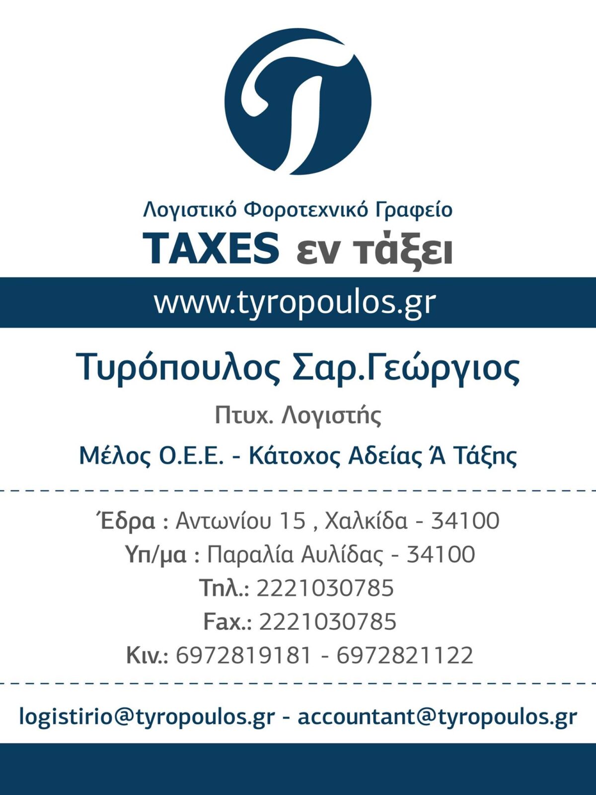 Ενημέρωση και τήρηση βιβλίων με απλογραφική και διπλογραφική μέθοδο. Συμβουλευτική ενημέρωση για την καλύτερη δυνατή εξέλιξη της επιχείρησής σας υπό την εποπτεία μα, Εργατικά και ασφαλιστικά θέματα. Ενημέρωση για τα επιδοτούμενα προγράμματα ΕΣΠΑ – ΟΑΕΔ κλπ. Δηλώσεις φορολογίας εισοδήματος φυσικών προσώπων και νομικών προσώπων. Περιοδικές και εκκαθαριστικές δηλώσεις, ΦΠΑ. Επίσης μπορούμε να σας ενημερώσουμε για την συνταξιοδότησή σας. Αυτές είναι μερικές από τις υπηρεσίες που σας προσφέρει το λογιστικό φοροτεχνικό γραφείο μας και το κυριότερο είμαστε δίπλα σας όποτε μας χρειαστείτε.